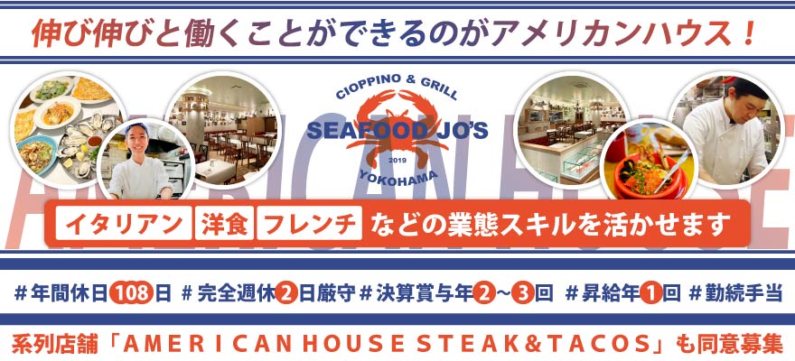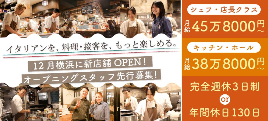 | 募集職種 | 1.料理長・料理長候補 、2.調理師・キッチンスタッフ 、3.店長・店長候補 、4.ホールスタッフ 、5.SV |