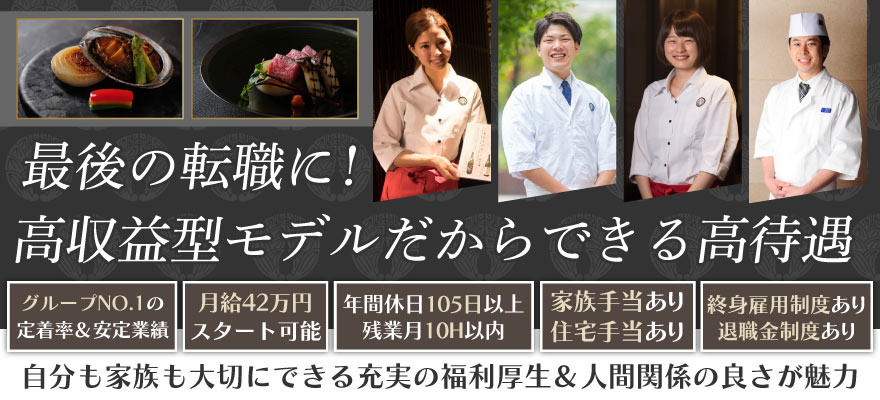 | 募集職種 | 1.料理長・料理長候補 、2.店長・店長候補 、3.女将・和装ホール 、4.調理師・キッチンスタッフ 、5.ホールスタッフ 、6.ソムリエ 、7.【ア】調理師・キッチンスタッフ 、8.【ア】ホールスタッフ |