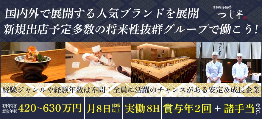 | 募集職種 | 1.寿司職人 、2.調理師・キッチンスタッフ 、3.店長・店長候補 、4.調理見習い 、5.天ぷら職人 、6.【ア】調理師・キッチンスタッフ 、7.【ア】寿司職人 、8.【ア】ホールスタッフ 、9.【ア】調理補助・洗い場 |