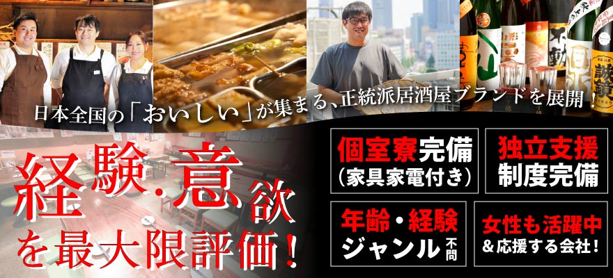 | 募集職種 | 1.料理長・料理長候補 、2.寿司職人 、3.焼鳥職人 、4.鉄板調理 、5.天ぷら職人 、6.店長・店長候補 、7.ソムリエ 、8.ホールスタッフ 、9.調理師・キッチンスタッフ 、10.調理見習い |