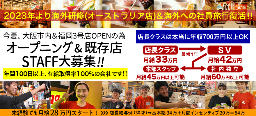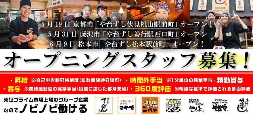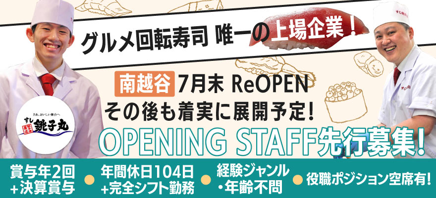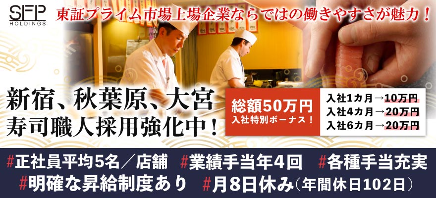 | 募集職種 | 1.店長・店長候補 、2.寿司職人 、3.ホールスタッフ 、4.料理長・料理長候補 、5.【ア】寿司職人 、6.【ア】調理師・キッチンスタッフ |