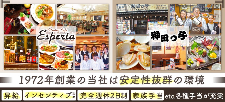 | 募集職種 | 1.料理長・料理長候補 、2.調理師・キッチンスタッフ 、3.調理見習い 、4.蕎麦職人・うどん職人 、5.店長・店長候補 、6.ホールスタッフ 、7.パティシエ・製菓 、8.パン職人・パン製造 、9.本部スタッフ |