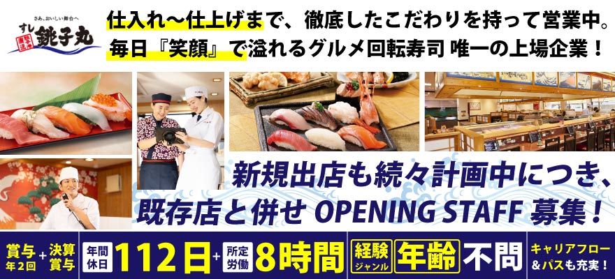 | 募集職種 | 1.店長・店長候補 、2.寿司職人 、3.ホールスタッフ 、4.料理長・料理長候補 、5.【ア】寿司職人 、6.【ア】調理師・キッチンスタッフ |