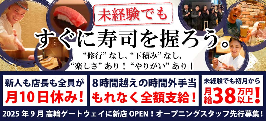 | 募集職種 | 1.寿司職人 、2.調理師・キッチンスタッフ 、3.店長・店長候補 、4.ホールスタッフ |