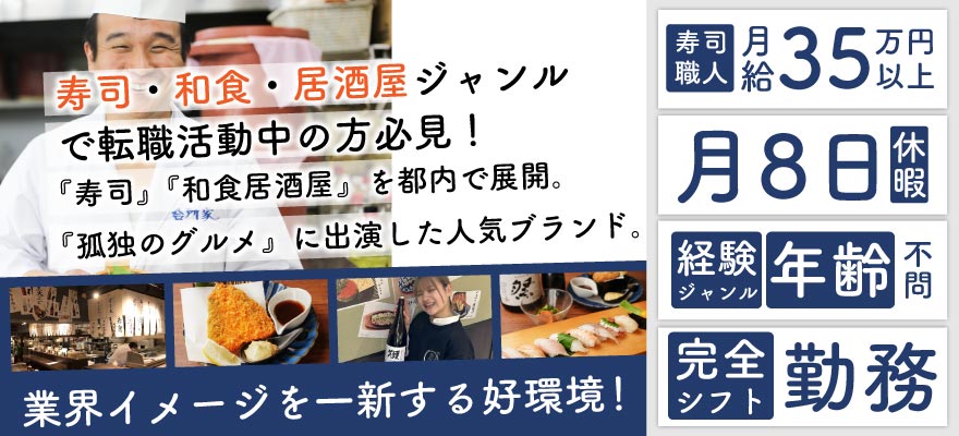 | 募集職種 | 1.寿司職人 、2.調理見習い 、3.店長・店長候補 、4.料理長・料理長候補 、5.【ア】寿司職人 、6.【ア】調理見習い 、7.【ア】ホールスタッフ |