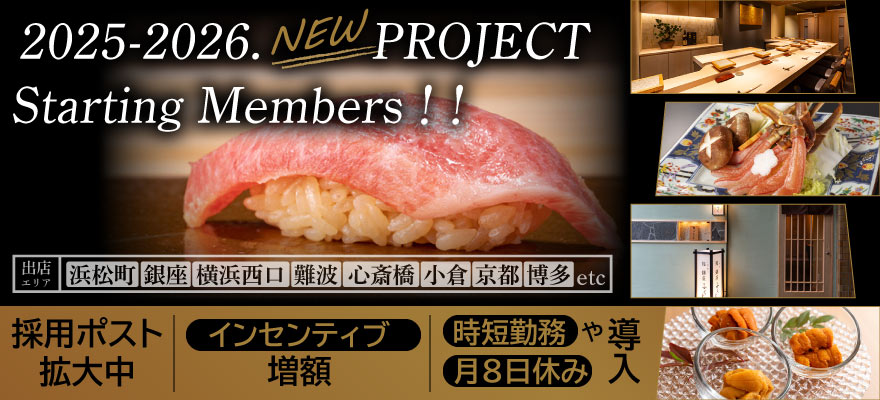 | 募集職種 | 1.料理長・料理長候補 、2.寿司職人 、3.焼鳥職人 、4.鉄板調理 、5.天ぷら職人 、6.店長・店長候補 、7.ソムリエ 、8.ホールスタッフ 、9.調理師・キッチンスタッフ 、10.調理見習い |