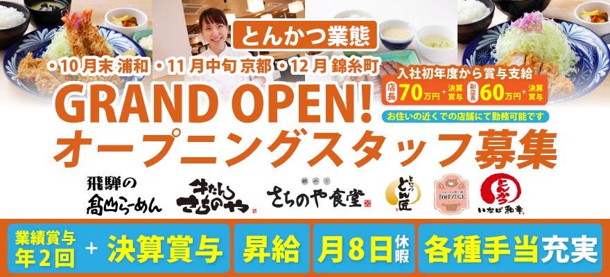 | 募集職種 | 1.料理長・料理長候補 、2.調理師・キッチンスタッフ 、3.店長・店長候補 、4.ホールスタッフ 、5.SV |