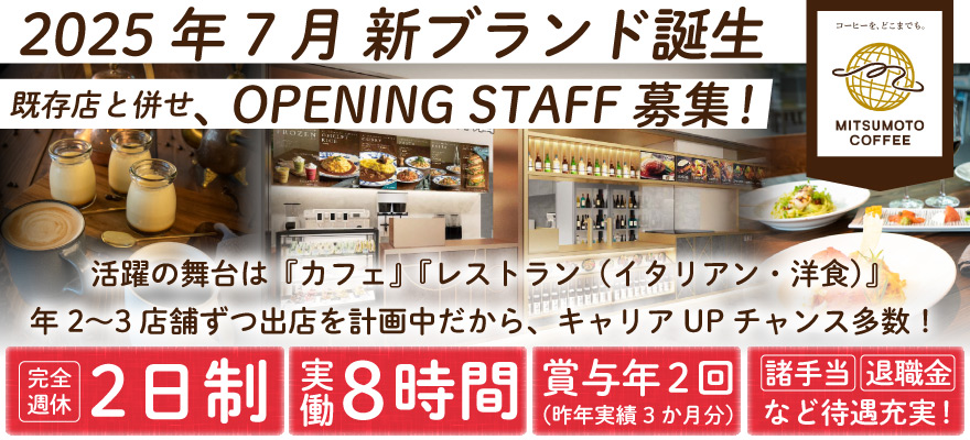 | 募集職種 | 1.料理長・料理長候補 、2.ソムリエ 、3.調理師・キッチンスタッフ 、4.ホールスタッフ 、5.店長・店長候補 、6.SV 、7.【ア】ホールスタッフ 、8.【ア】調理師・キッチンスタッフ |