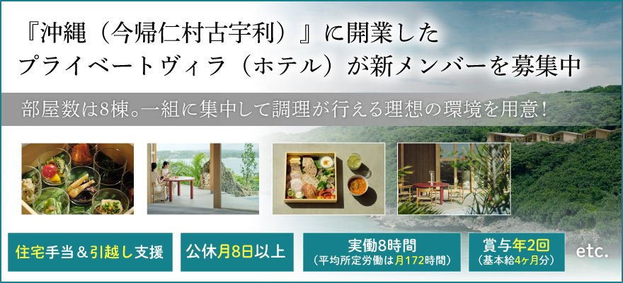 | 募集職種 | 1.料理長・料理長候補 、2.調理師・キッチンスタッフ 、3.店長・店長候補 、4.ホールスタッフ 、5.【ア】ホールスタッフ 、6.【ア】調理師・キッチンスタッフ |
