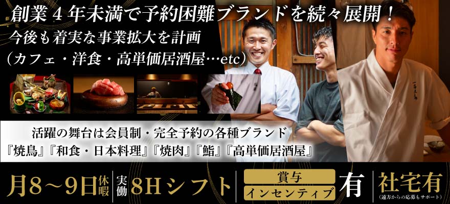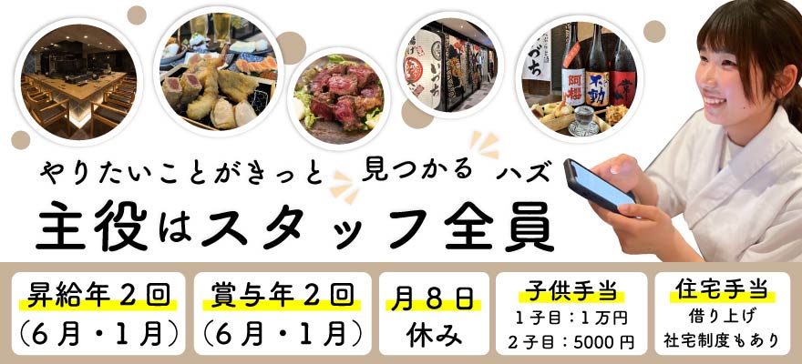 | 募集職種 | 1.料理長・料理長候補 、2.店長・店長候補 、3.寿司職人 、4.調理師・キッチンスタッフ 、5.蕎麦職人・うどん職人 、6.ホールスタッフ 、7.販売 |