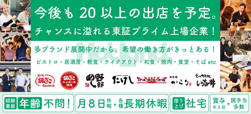 | 募集職種 | 1.SV 、2.店長・店長候補 、3.料理長・料理長候補 、4.焼鳥職人 、5.天ぷら職人 、6.調理師・キッチンスタッフ 、7.ホールスタッフ 、8.調理見習い 、9.【ア】調理師・キッチンスタッフ 、10.【ア】ホールスタッフ 、11.【ア】調理見習い |
