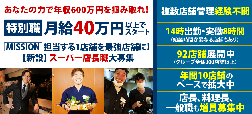 | 募集職種 | 1.料理長・料理長候補 、2.店長・店長候補 、3.寿司職人 、4.調理師・キッチンスタッフ 、5.焼鳥職人 、6.ホールスタッフ 、7.調理見習い |