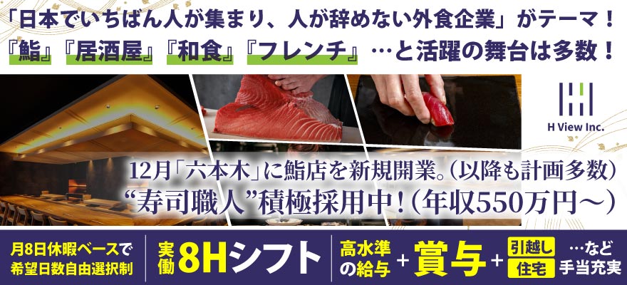 | 募集職種 | 1.寿司職人 、2.料理長・料理長候補 、3.店長・店長候補 、4.調理師・キッチンスタッフ 、5.ホールスタッフ 、6.調理見習い 、7.ソムリエ 、8.SV |