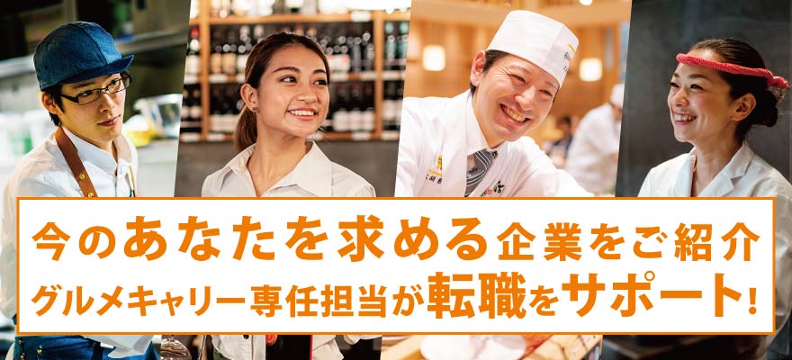 | 募集職種 | 1.料理長・料理長候補 、2.調理師・キッチンスタッフ 、3.調理見習い 、4.SV 、5.店長・店長候補 、6.ソムリエ 、7.ホールスタッフ 、8.女将・和装ホール 、9.パティシエ・製菓 、10.パン職人・パン製造 、11.寿司職人 、12.鉄板調理 、13.焼鳥職人 、14.天ぷら職人 、15.蕎麦職人・うどん職人 、16.ピッツァイオーロ 、17.バーテンダー 、18.栄養士・管理栄養士 、19.レセプショニスト 、20.販売 |