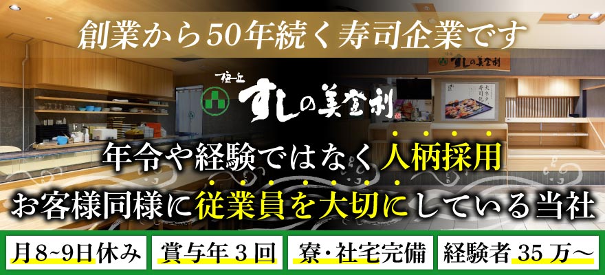 | 募集職種 | 1.寿司職人 、2.調理見習い 、3.調理師・キッチンスタッフ 、4.ホールスタッフ 、5.【ア】調理師・キッチンスタッフ 、6.【ア】ホールスタッフ |