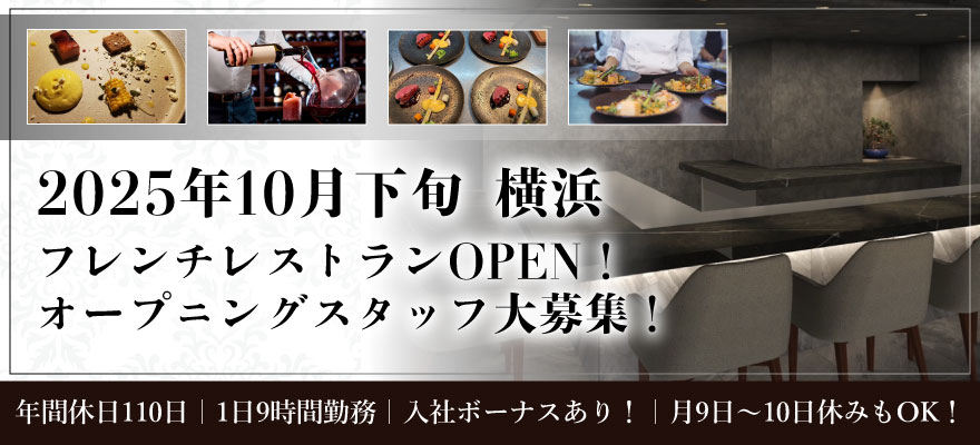 | 募集職種 | 1.料理長・料理長候補 、2.店長・店長候補 、3.調理師・キッチンスタッフ 、4.ホールスタッフ 、5.ソムリエ 、6.バリスタ 、7.SV 、8.【ア】調理師・キッチンスタッフ 、9.【ア】ホールスタッフ 、10.【ア】調理補助・洗い場 |