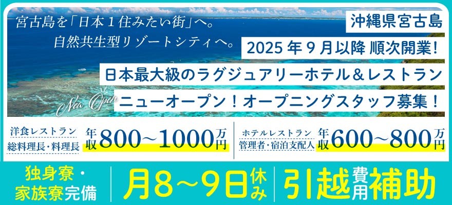 2026年春宮古島にオープンするリゾートホテルのオープニング料理長募集、既存ホテルの料理長・副料理長スタッフを募集いたします☆経験・スキルによっては、月給50万円以上のスタートも可能!
