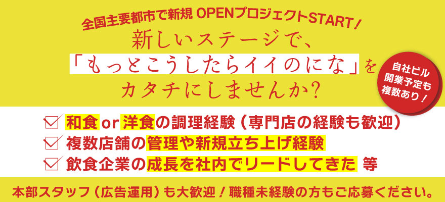 | 募集職種 | 1.調理師・キッチンスタッフ 、2.調理見習い 、3.料理長・料理長候補 、4.ホールスタッフ 、5.店長・店長候補 、6.【ア】調理師・キッチンスタッフ 、7.【ア】調理見習い 、8.【ア】ホールスタッフ |