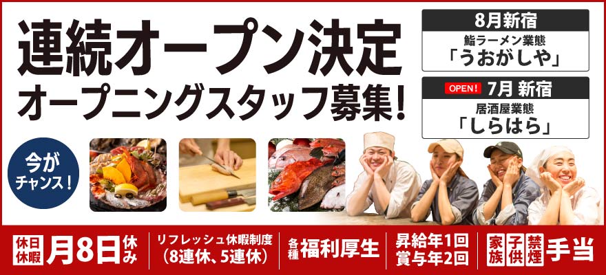 | 募集職種 | 1.店長・店長候補 、2.調理師・キッチンスタッフ 、3.調理見習い 、4.料理長・料理長候補 、5.ホールスタッフ 、6.寿司職人 、7.【ア】調理師・キッチンスタッフ 、8.【ア】ホールスタッフ 、9.【ア】その他 |