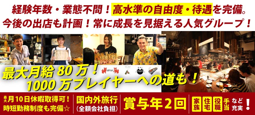 | 募集職種 | 1.店長・店長候補 、2.料理長・料理長候補 、3.SV 、4.調理師・キッチンスタッフ 、5.ホールスタッフ 、6.調理見習い |