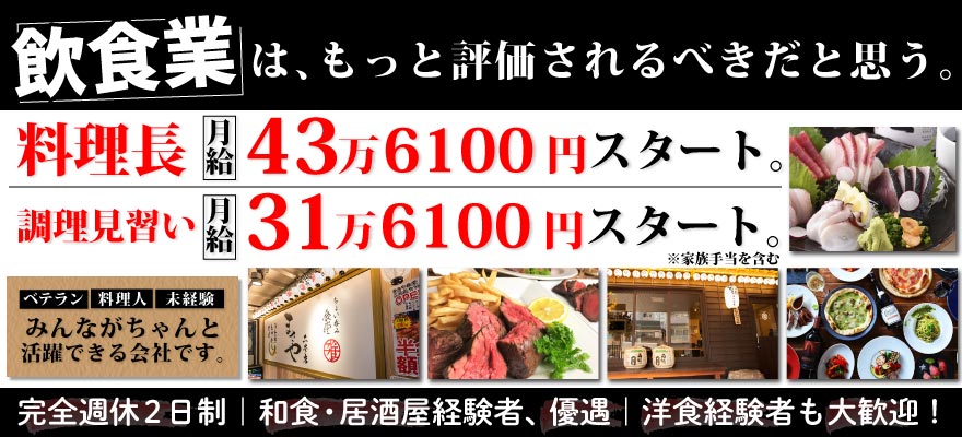 | 募集職種 | 1.料理長・料理長候補 、2.調理師・キッチンスタッフ 、3.ホールスタッフ 、4.調理見習い 、5.店長・店長候補 、6.寿司職人 、7.焼鳥職人 、8.本部スタッフ 、9.その他 、10.バーテンダー |