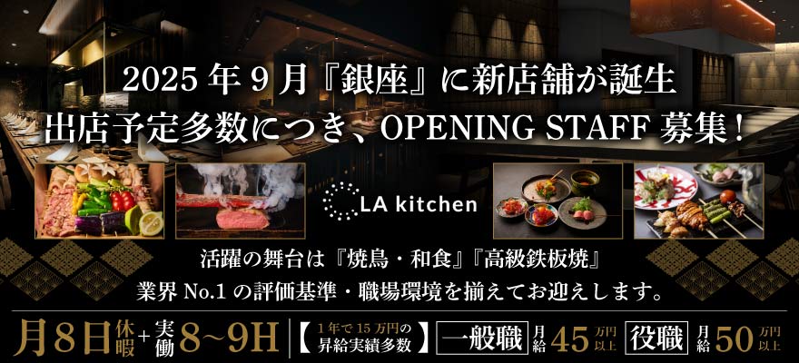 | 募集職種 | 1.料理長・料理長候補 、2.店長・店長候補 、3.調理師・キッチンスタッフ 、4.ホールスタッフ 、5.調理見習い 、6.ピッツァイオーロ 、7.女将・和装ホール 、8.バーテンダー 、9.ソムリエ 、10.レセプショニスト 、11.鉄板調理 、12.パティシエ・製菓 、13.寿司職人 、14.焼鳥職人 、15.【ア】調理師・キッチンスタッフ 、16.【ア】ホールスタッフ 、17.【ア】レセプショニスト 、18.【ア】バーテンダー 、19.本部スタッフ 、20.SV |