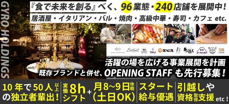 | 募集職種 | 1.料理長・料理長候補 、2.店長・店長候補 、3.寿司職人 、4.調理師・キッチンスタッフ 、5.蕎麦職人・うどん職人 、6.ホールスタッフ 、7.販売 |