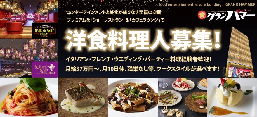 | 募集職種 | 1.料理長・料理長候補 、2.調理師・キッチンスタッフ 、3.調理見習い 、4.SV 、5.店長・店長候補 、6.ソムリエ 、7.ホールスタッフ 、8.女将・和装ホール 、9.パティシエ・製菓 、10.パン職人・パン製造 、11.寿司職人 、12.鉄板調理 、13.焼鳥職人 、14.天ぷら職人 、15.蕎麦職人・うどん職人 、16.ピッツァイオーロ 、17.バーテンダー 、18.栄養士・管理栄養士 、19.レセプショニスト 、20.販売 |