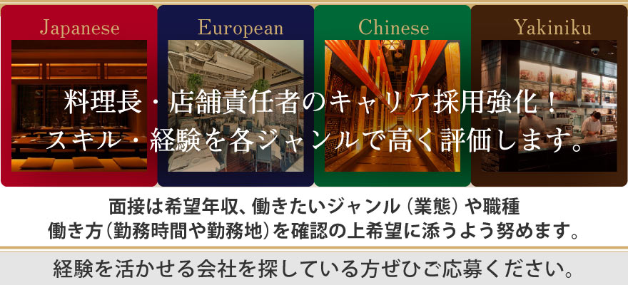 副店長や副料理長としてキャリアスタートを目指す、飲食店経験者に大きなチャンスが多数。