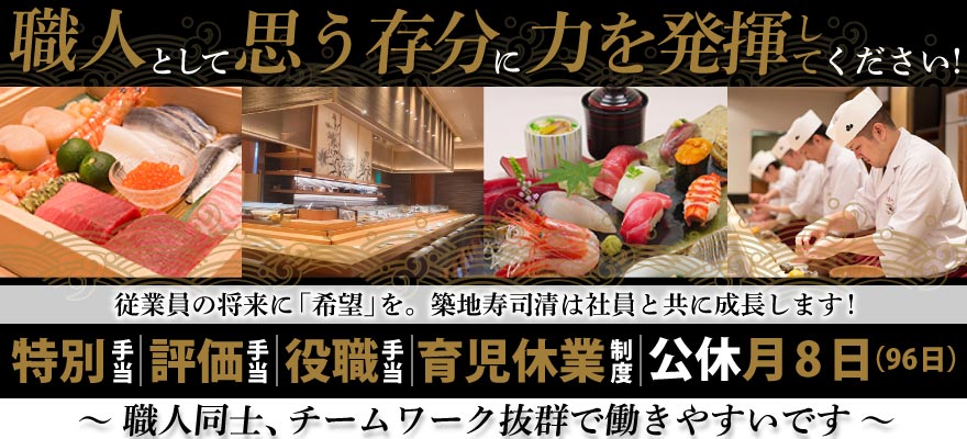 | 募集職種 | 1.料理長・料理長候補 、2.店長・店長候補 、3.調理師・キッチンスタッフ 、4.ホールスタッフ 、5.SV 、6.寿司職人 、7.【ア】調理師・キッチンスタッフ 、8.【ア】ホールスタッフ |