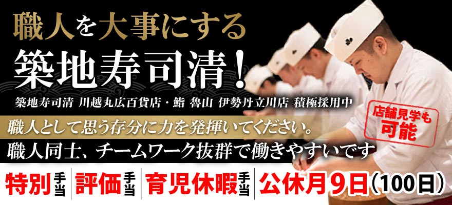 | 募集職種 | 1.寿司職人 、2.ホールスタッフ 、3.店長・店長候補 、4.料理長・料理長候補 、5.調理師・キッチンスタッフ |