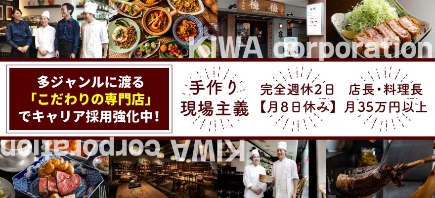 | 募集職種 | 1.調理師・キッチンスタッフ 、2.販売 、3.ホールスタッフ 、4.女将・和装ホール 、5.料理長・料理長候補 、6.店長・店長候補 、7.SV 、8.本部スタッフ 、9.食品加工・製造 |