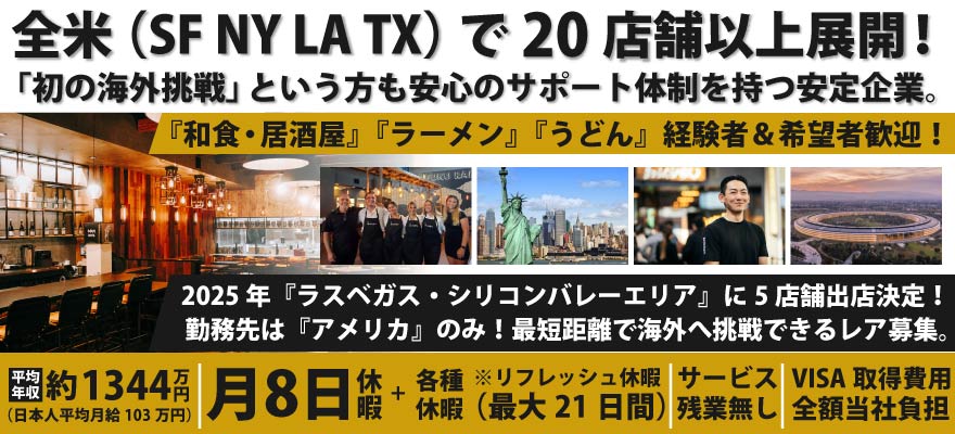 | 募集職種 | 1.料理長・料理長候補 、2.調理師・キッチンスタッフ 、3.調理見習い 、4.寿司職人 、5.天ぷら職人 、6.鉄板調理 、7.店長・店長候補 、8.ホールスタッフ 、9.女将・和装ホール 、10.本部スタッフ 、11.【ア】調理師・キッチンスタッフ 、12.【ア】ホールスタッフ 、13.【ア】女将・和装ホール 、14.【ア】調理補助・洗い場 、15.【ア】調理見習い |