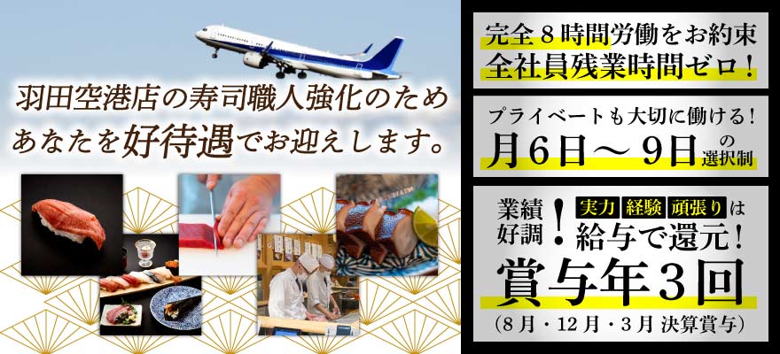 | 募集職種 | 1.料理長・料理長候補 、2.寿司職人 、3.鉄板調理 、4.天ぷら職人 、5.店長・店長候補 、6.調理師・キッチンスタッフ 、7.調理見習い |