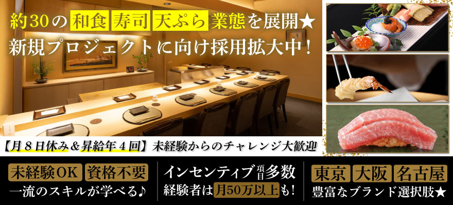 | 募集職種 | 1.料理長・料理長候補 、2.寿司職人 、3.女将・和装ホール 、4.店長・店長候補 、5.調理師・キッチンスタッフ 、6.調理見習い 、7.【ア】寿司職人 、8.【ア】調理師・キッチンスタッフ 、9.【ア】ホールスタッフ 、10.【ア】調理見習い |