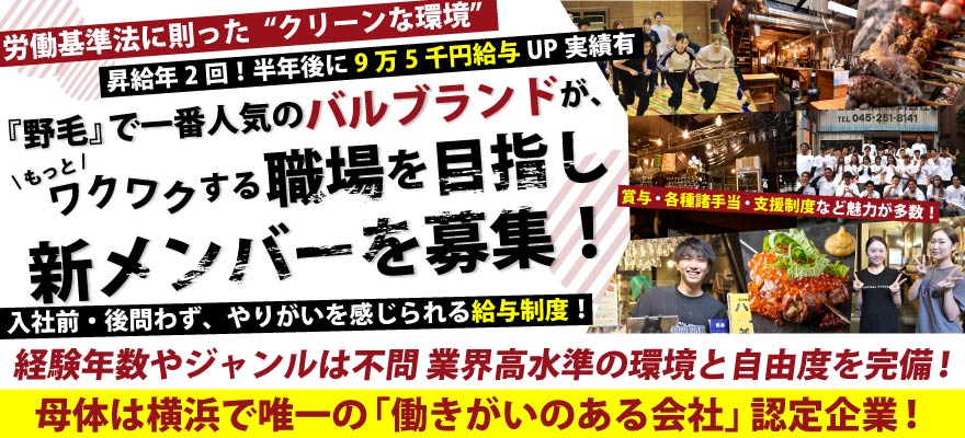 | 募集職種 | 1.【契】調理師・キッチンスタッフ 、2.【契】調理見習い 、3.【契】ホールスタッフ 、4.料理長・料理長候補 、5.店長・店長候補 、6.焼鳥職人 、7.調理師・キッチンスタッフ 、8.ホールスタッフ 、9.【ア】調理師・キッチンスタッフ 、10.【ア】ホールスタッフ |