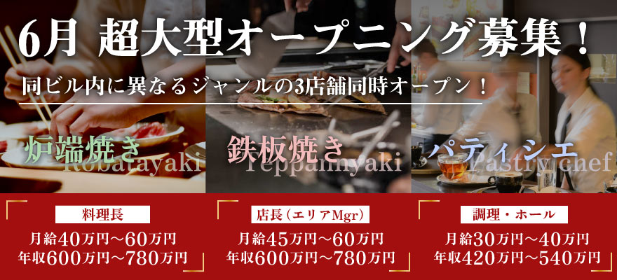 | 募集職種 | 1.料理長・料理長候補 、2.店長・店長候補 、3.女将・和装ホール 、4.調理師・キッチンスタッフ 、5.ホールスタッフ 、6.ソムリエ 、7.【ア】調理師・キッチンスタッフ 、8.【ア】ホールスタッフ |