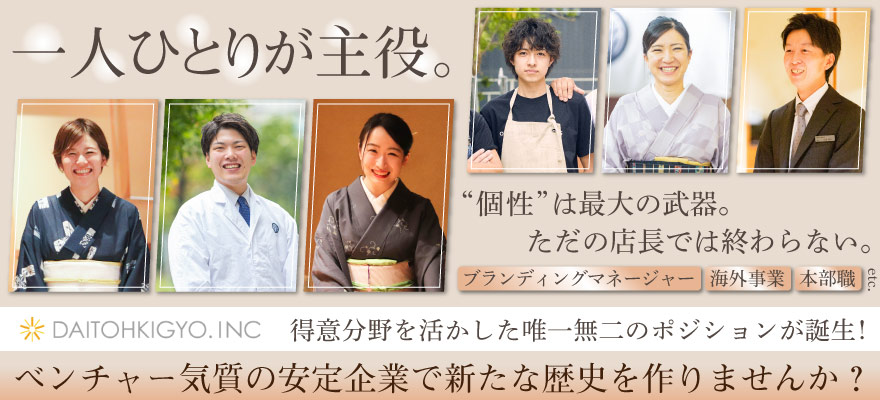 勤続と実績次第で社内独立のチャンスも!自分のお店を持ちたい、将来は経営に関わりたい方を応援!マレーシア勤務では大学に通いながら働くことも可能。海外でキャリアとスキルを同時に伸ばせます。やる気があれば年齢も経験も関係なし。日本のおもてなしを世界へ広げましょう!
