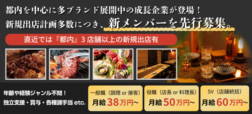 | 募集職種 | 1.料理長・料理長候補 、2.寿司職人 、3.焼鳥職人 、4.鉄板調理 、5.天ぷら職人 、6.店長・店長候補 、7.ソムリエ 、8.ホールスタッフ 、9.調理師・キッチンスタッフ 、10.調理見習い |