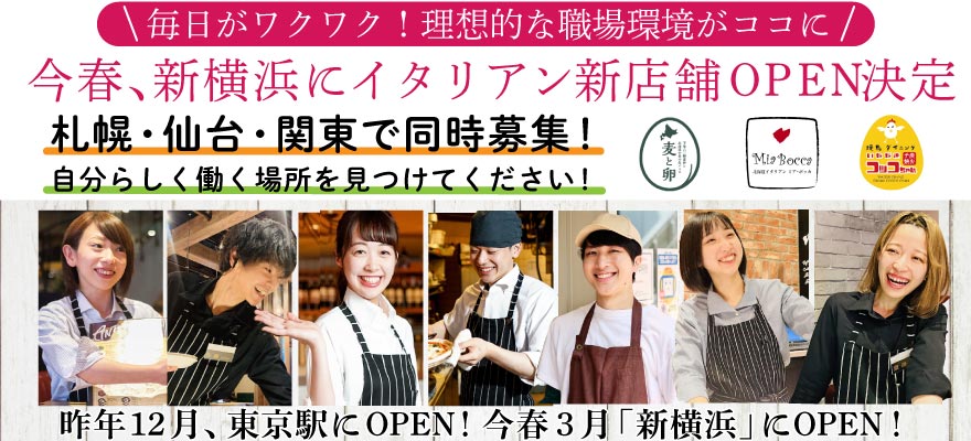 | 募集職種 | 1.店長・店長候補 、2.料理長・料理長候補 、3.調理師・キッチンスタッフ 、4.ピッツァイオーロ 、5.ホールスタッフ 、6.パティシエ・製菓 、7.パン職人・パン製造 、8.その他 |