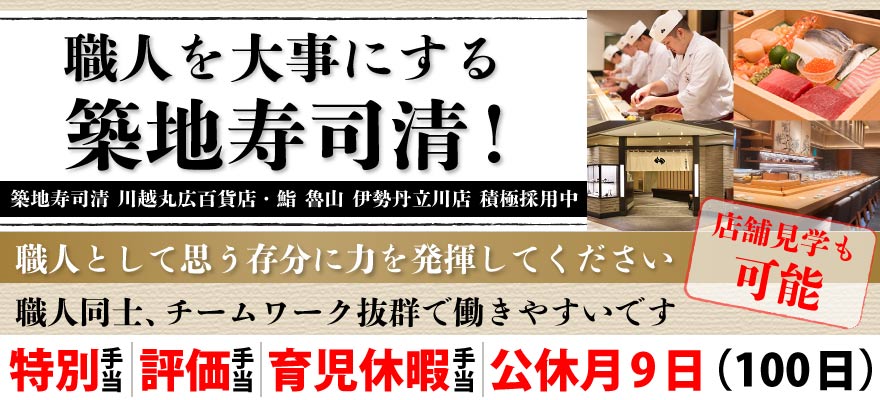 | 募集職種 | 1.店長・店長候補 、2.寿司職人 、3.ホールスタッフ 、4.料理長・料理長候補 、5.【ア】寿司職人 、6.【ア】調理師・キッチンスタッフ |