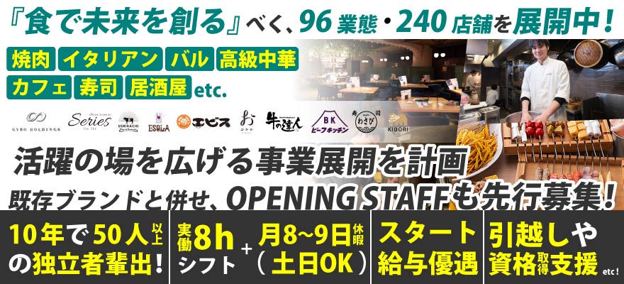 | 募集職種 | 1.店長・店長候補 、2.料理長・料理長候補 、3.SV 、4.調理師・キッチンスタッフ 、5.ホールスタッフ 、6.調理見習い |