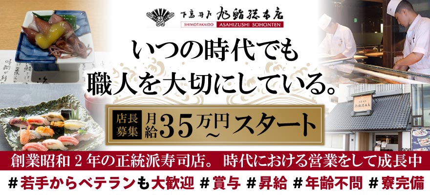 | 募集職種 | 1.料理長・料理長候補 、2.調理師・キッチンスタッフ 、3.パティシエ・製菓 、4.ホールスタッフ 、5.店長・店長候補 、6.調理見習い 、7.寿司職人 、8.ソムリエ 、9.その他 、10.SV 、11.販売 |