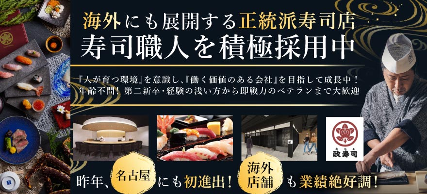 | 募集職種 | 1.寿司職人 、2.調理見習い 、3.調理師・キッチンスタッフ 、4.ホールスタッフ 、5.【ア】調理師・キッチンスタッフ 、6.【ア】ホールスタッフ |