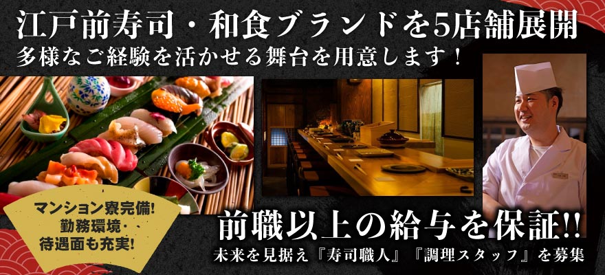 | 募集職種 | 1.寿司職人 、2.調理師・キッチンスタッフ 、3.店長・店長候補 、4.調理見習い 、5.天ぷら職人 、6.【ア】調理師・キッチンスタッフ 、7.【ア】寿司職人 、8.【ア】ホールスタッフ 、9.【ア】調理補助・洗い場 |