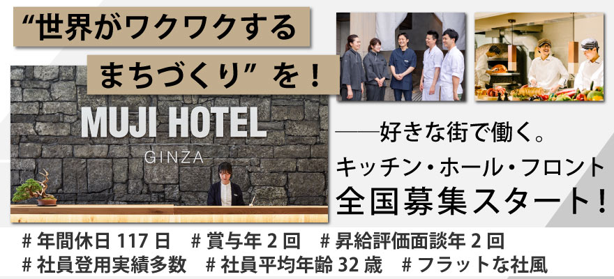 | 募集職種 | 1.料理長・料理長候補 、2.調理師・キッチンスタッフ 、3.調理見習い 、4.蕎麦職人・うどん職人 、5.店長・店長候補 、6.ホールスタッフ 、7.パティシエ・製菓 、8.パン職人・パン製造 、9.本部スタッフ |