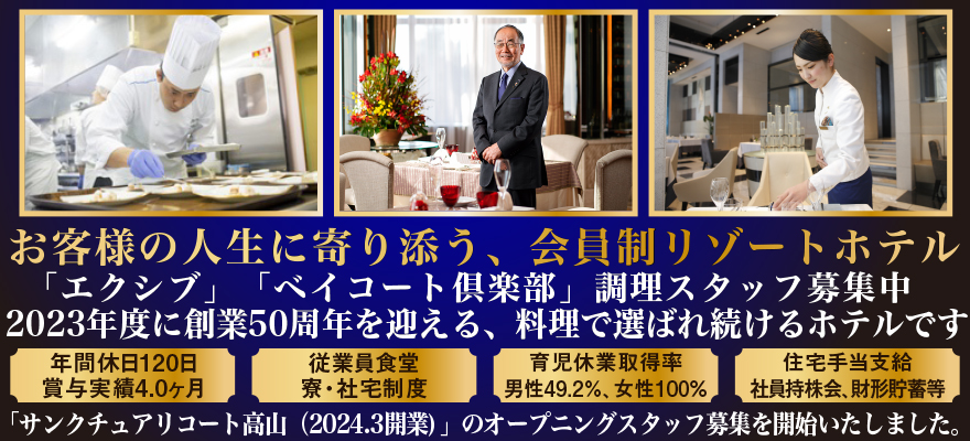 | 募集職種 | 1.料理長・料理長候補 、2.調理師・キッチンスタッフ 、3.調理見習い 、4.栄養士・管理栄養士 、5.店長・店長候補 、6.ホールスタッフ 、7.女将・和装ホール 、8.【ア】調理師・キッチンスタッフ 、9.【ア】調理見習い 、10.【ア】調理補助・洗い場 、11.【ア】ホールスタッフ 、12.【ア】女将・和装ホール 、13.【ア】レセプショニスト 、14.【ア】販売 |