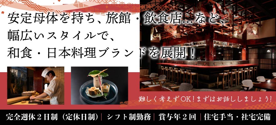 | 募集職種 | 1.料理長・料理長候補 、2.調理師・キッチンスタッフ 、3.調理見習い 、4.蕎麦職人・うどん職人 、5.店長・店長候補 、6.ホールスタッフ 、7.パティシエ・製菓 、8.パン職人・パン製造 、9.本部スタッフ |